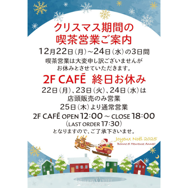 大変恐縮ではございますが、2025年12月22日(月)~12月24日(水)まで、2Fカフェスペースの営業を休止させていただきます。